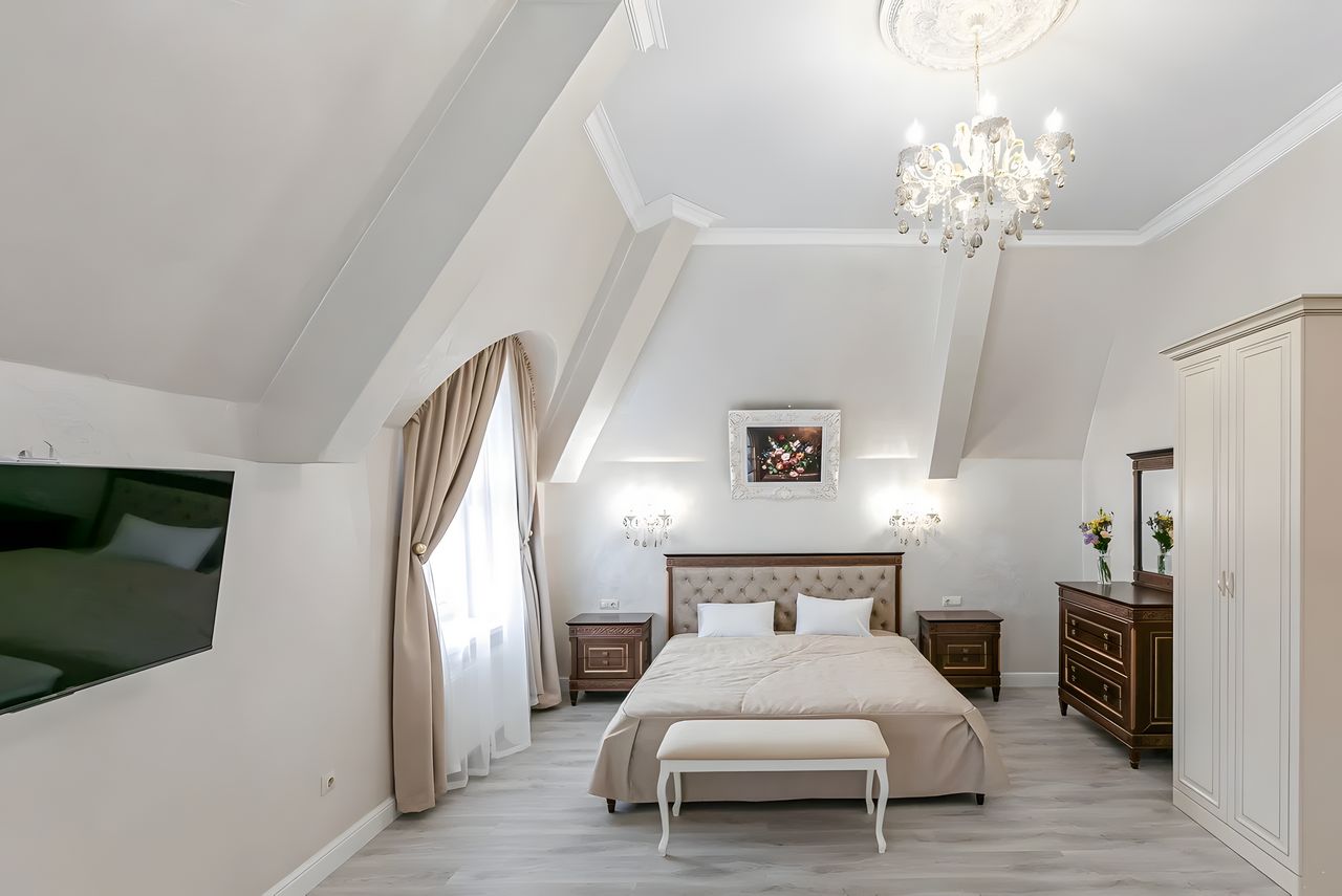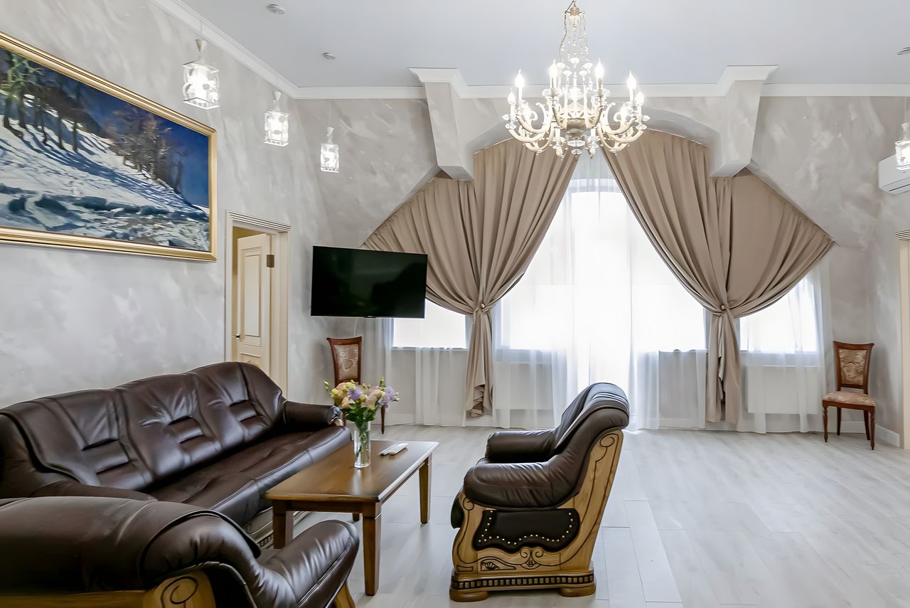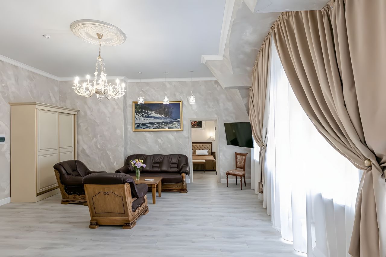 Отель «Александр» расположен в курортной зоне Кисловодска, рядом с входом в Национальный парк. В рамках сотрудничества компания «Мебель Белорусская» оформила три пентхауса: стандартный, семейный и видовой. Для проекта была выбрана мебель премиального уровня из коллекций Бристоль (классическая деревянная серия) и Лика (производство «Молодечномебель»). Дополнительно установлены кожаные диваны на деревянном каркасе Консул-2020, журнальные столы Верди и стулья из массива серии Премиум от производителя Пинскдрев.